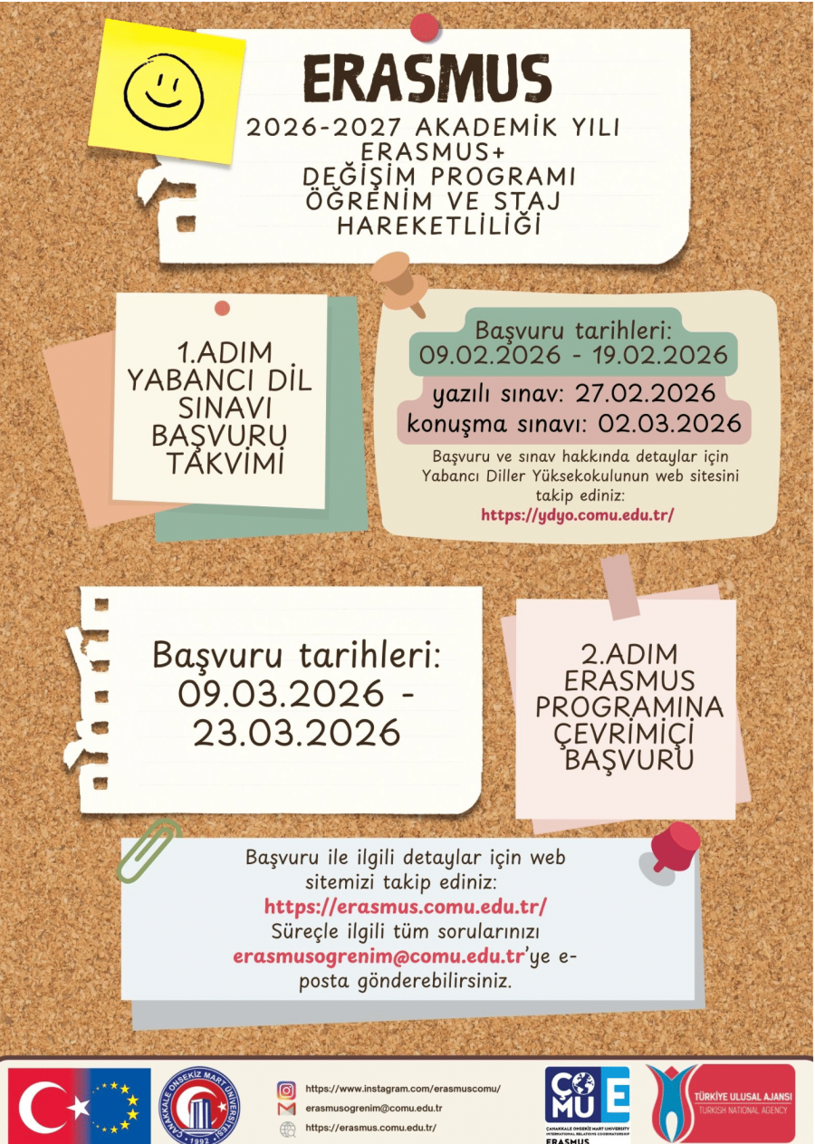 Başvuru ve sınav süreçlerine ilişkin detaylı bilgilere https://ydyo.comu.edu.tr/ ve https://erasmus.comu.edu.tr/ adreslerinden ulaşılabilir, süreçle ilgili sorular için erasmusogrenim@comu.edu.tr e-posta adresi üzerinden iletişime geçilebilirsiniz.